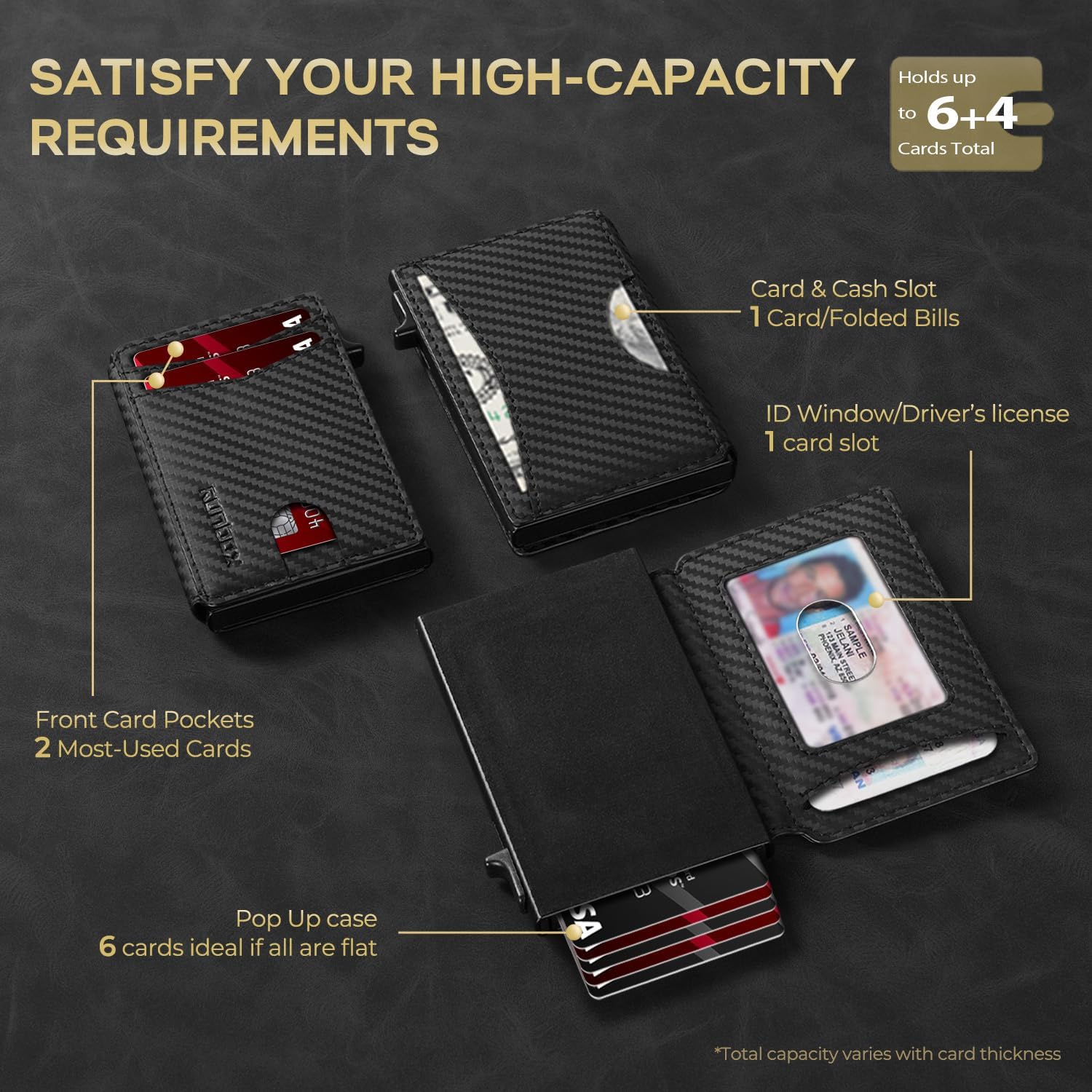- QUICKEST ACCESS: Get instant card access with just one hand by tapping a button. The front pocket holds your 2 most-used cards, while the pop-up aluminum card holder stores 1-6 cards (The actual capacity depends on the card thickness ) . Features an ID window for your driver’s license and a back pocket that fits one card or cash