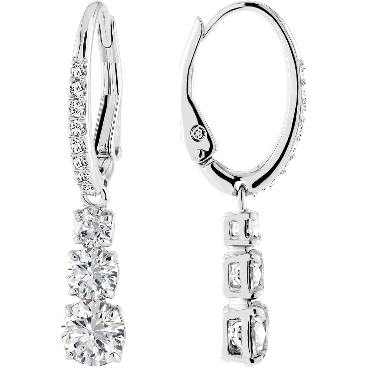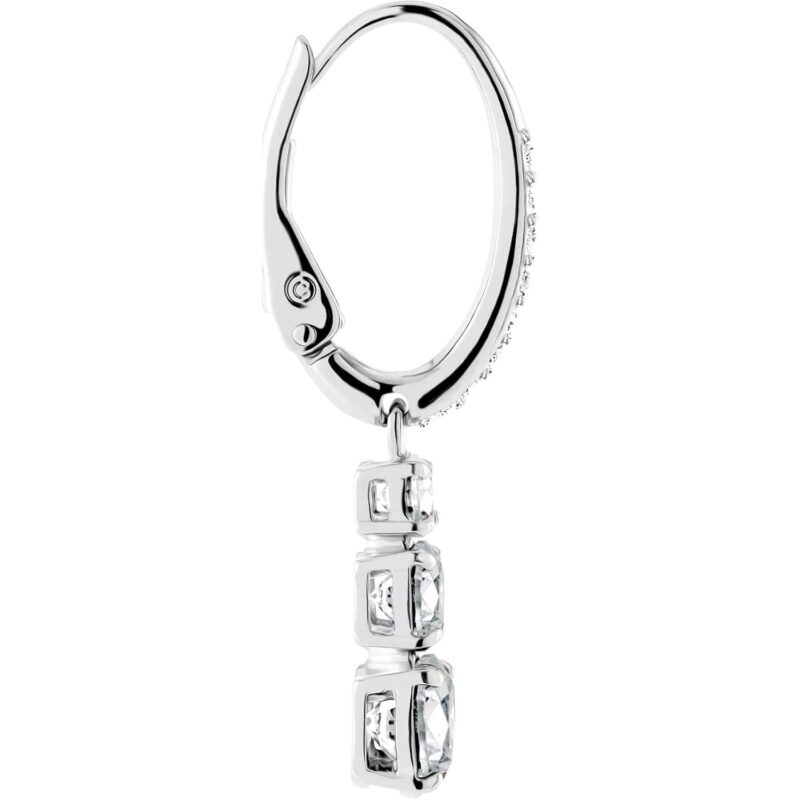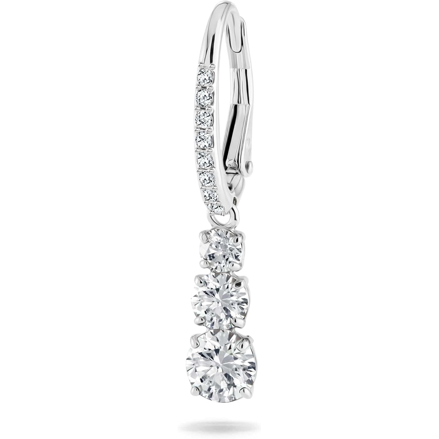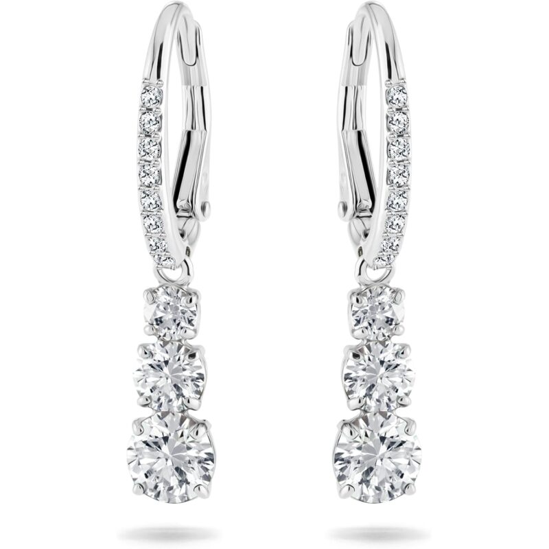 - Items delivered: 1 x set of Swarovski Stilla Attract Trilogy drop pierced earrings with white crystals in a rhodium plated setting and hinged closure, complete with Swarovski earring box