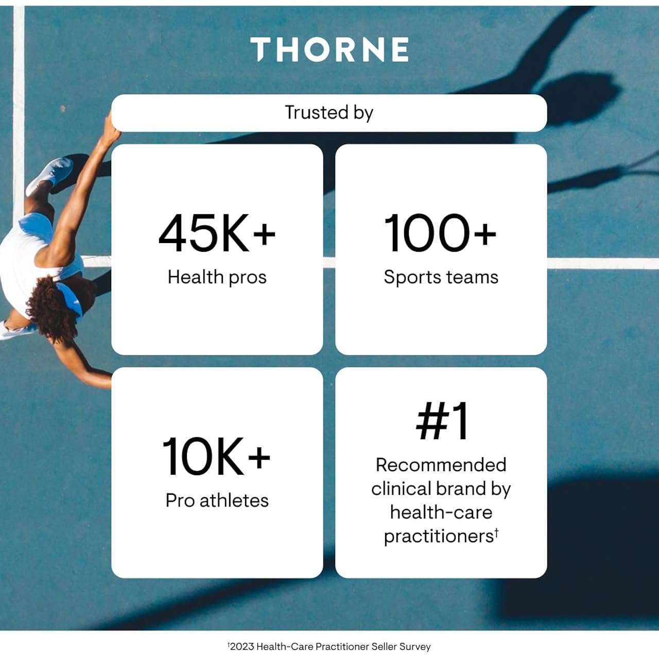 - Trusted: Thorne is chosen by champions and trusted by 100+ professional sports teams, a proud partner of U.S. National Teams, and the #1 recommended clinical brand by health-care practitioners (2023 Health-Care Practitioner Seller Survey)