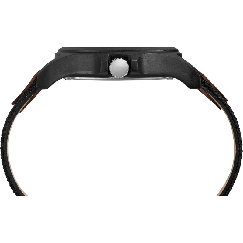 - Black dial with full Arabic numerals; Date window at 3 o’clock; 24-hour military time