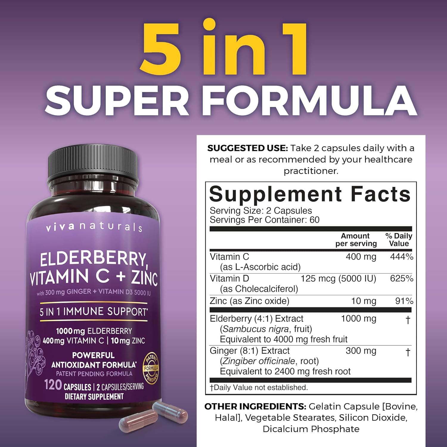 - Sambucus Elderberry Extract with Zinc and Vitamin C – Viva Naturals Elderberry supplement for adults combines the strength of five high quality immune supporting ingredients.* We have included a high potency of Vitamins C and D for immune support.*