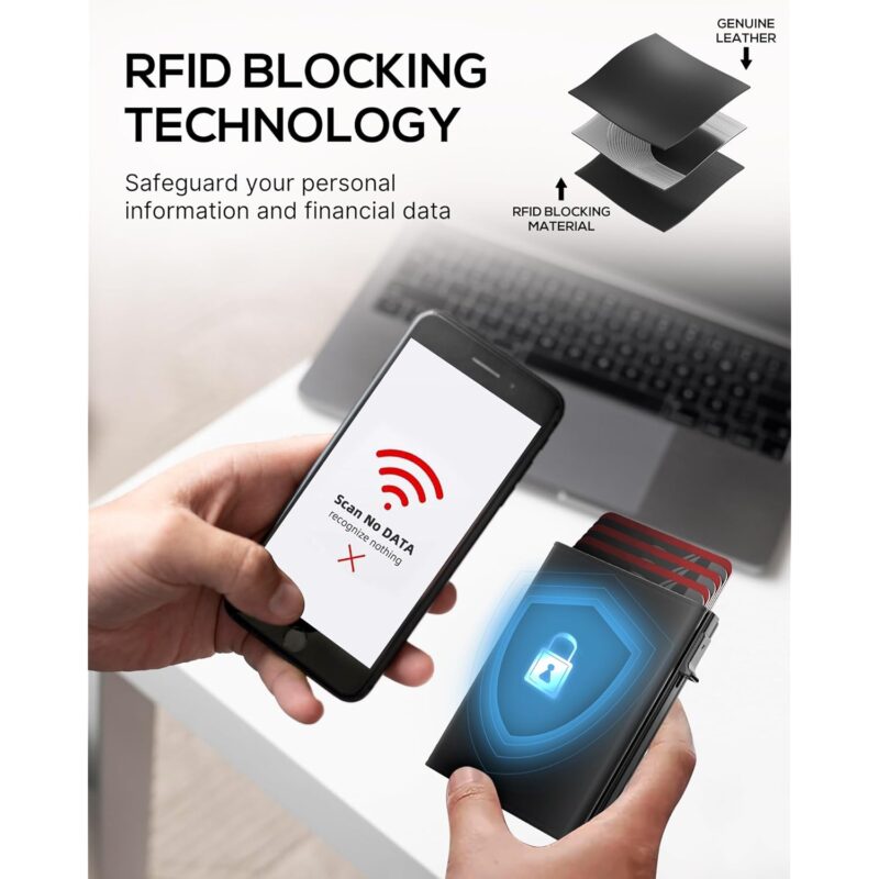 - ăADVANCED RFID BLOCKINGă Safeguard your personal and financial information with confidence. The secure wallet features cutting-edge RFID blocking technology, effectively creating a shield against unwanted digital intrusion, leaving you in control of your data.