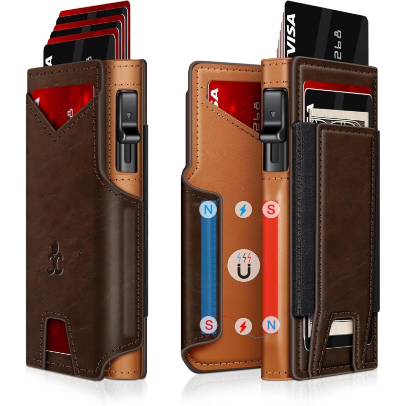 QUICK & EASY CARD ACCESS: Unlike traditional leather wallets, SEMORID rfid wallet for men features an aluminum card case with an eject mechanism. Simply press the button and all cards pop out in a stepped pattern, making retrieval quick and convenient.