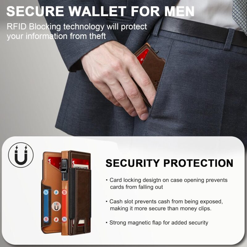 SLIM BODY WITH LARGE CAPACITY: This slim wallet for men fits easily into front pocket, holding up to 10 cards (5-7 in aluminum case, 3 in leather cover with ID window), plus cash slot for 3 more cards.