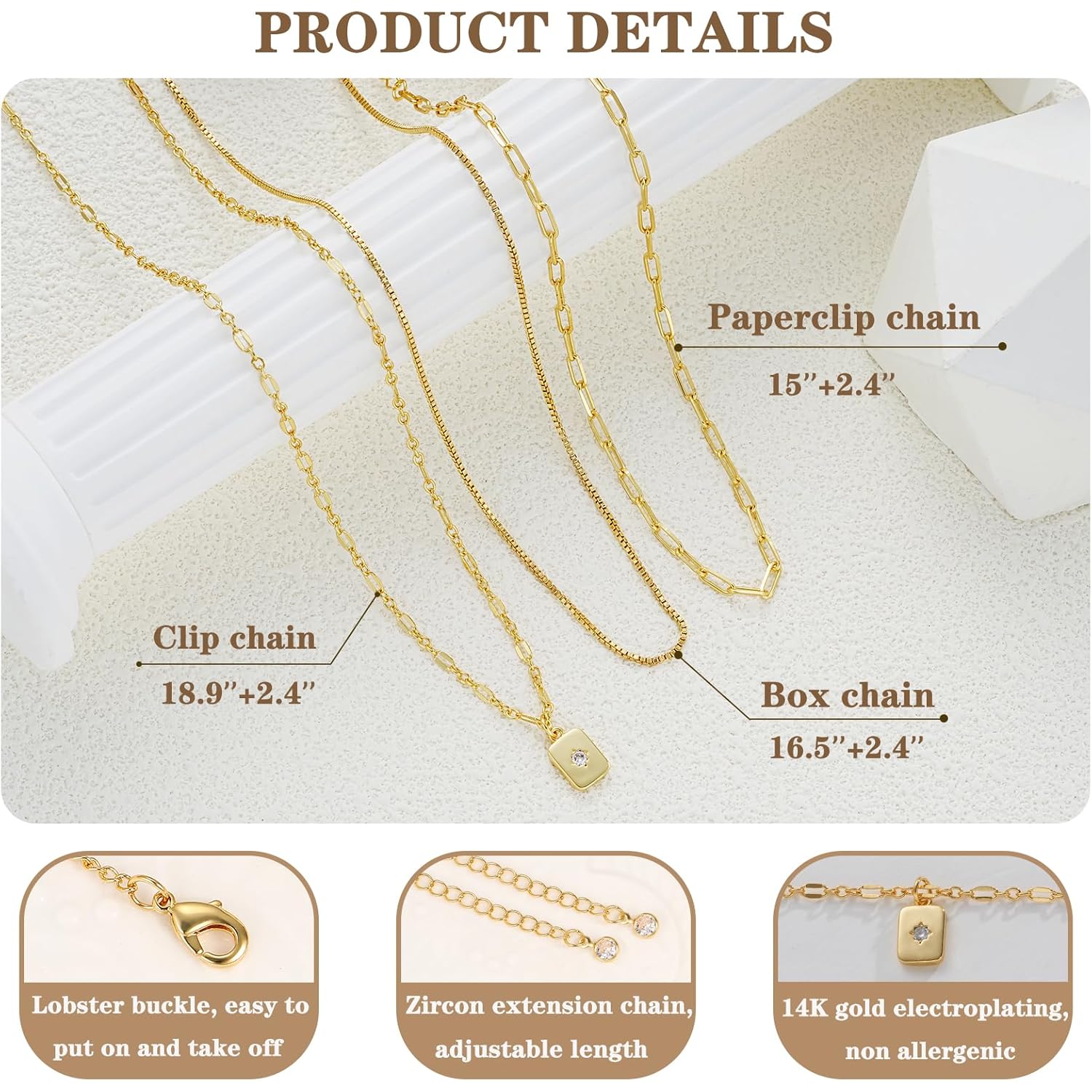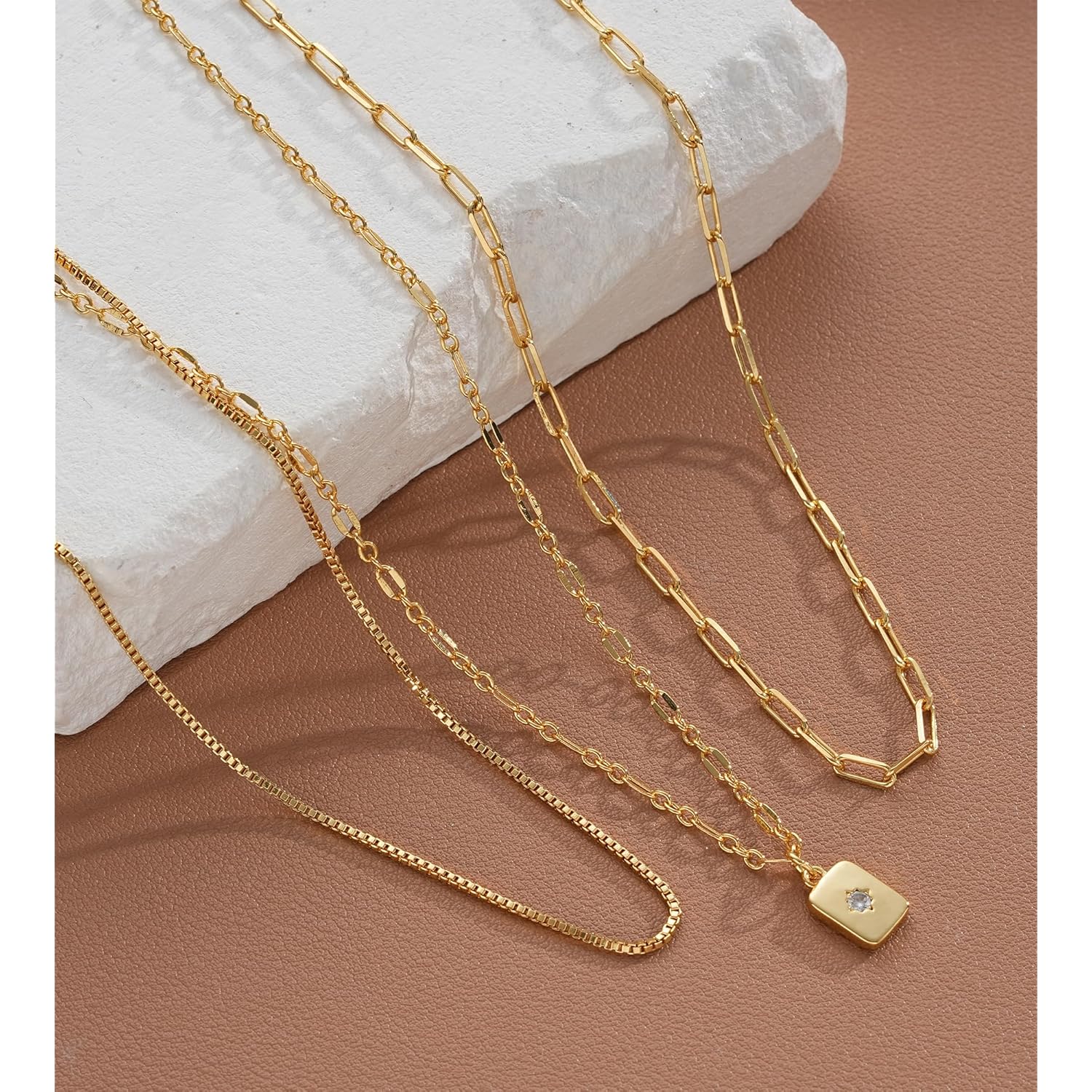YEEZII Layered Gold Necklaces for Women Trendy, 3 Pcs 14K Gold Plated Choker Paperclip Box Chain Necklace, Stackable Women’s Gold Pendant Necklaces Jewelry Set